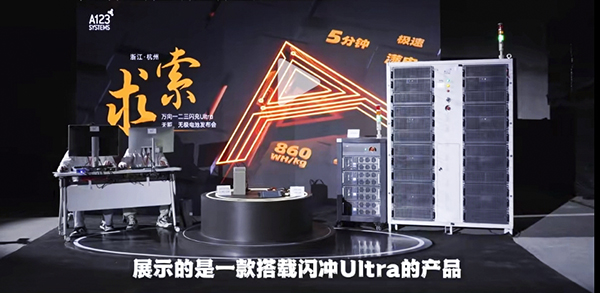 星云150V 400A模組充放電測(cè)試系統(tǒng)(右一)、星云10V300A電芯充放電測(cè)試系統(tǒng)(右二)出現(xiàn)在萬向一二三12C超高倍率“閃充Ultra電池”發(fā)布會(huì)視頻中